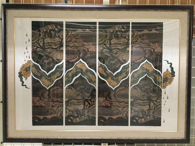 藝術家劉子平的創作題材來自周遭的生活經驗,近年的創作進一步反映出更大的框架,轉向思考環境的破壞與改變。 作品〈鏈結與循環〉以木板多色套印創作。畫面裡,雨露滋潤大地,碩大的龍魚在河水裡悠游,象徵著川流不息的生命泉源;而金色與青色的抽象圖騰,如同生命循環的鎖鏈,聯繫著不同的生命個體,孕育萬物的循環與再生。 藝術家藉由獨特的構圖,刻畫生命個體在宇宙間運行的姿態。