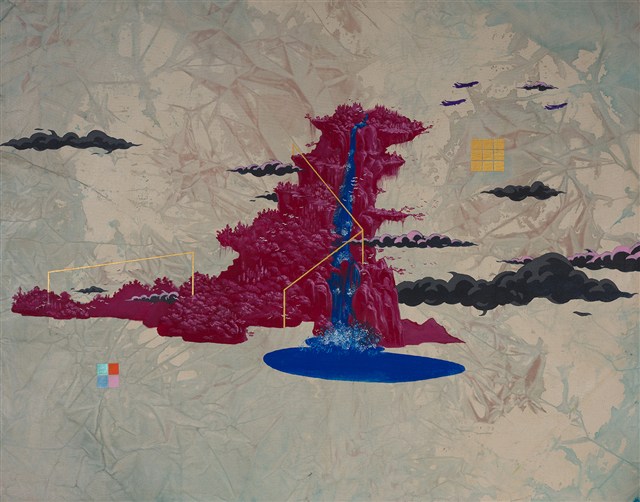 藝術家蔡士弘從動漫、電影、攝影等擷取影像元素,在繪畫中製造出日常差異的奇觀景象。作品〈暴龍島〉,兩幅畫面中,一邊是無邊境的海洋,一艘飛機的影子,以前方的目標記號為基準,持續前進。另一邊,充滿地貌紋理的背景中,一座紅色如暴龍形體的島嶼浮現在其中,島嶼中還貫穿著藍色的瀑布,其周圍則盤旋著幾架視察戰鬥機。蔡士弘的作品帶有對於國族邊界的另類想像,以及國家之間的權力關係,映照當代奇觀社會的現實處境。