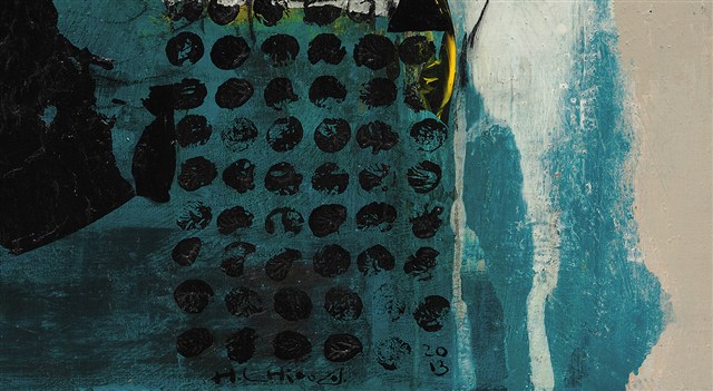 藝術家黃秋月,以抽象畫作表達生命的內在情感與體悟。作品〈時間迷路〉,橘、藍、白等色彩,層次分明地相互交疊著,形構出節奏分明的畫面。乾擦、拓印、刮痕與滴濺等不同紋理的表現,交織出各種層次與質感。黑色的鉛筆線條,隨興恣意地遺留下痕跡,與富秩序感的黑色圓點相互對應,形同內在心情的書寫與紀錄。黃秋月以富有東方筆墨意境的抽象畫作,試圖捕捉時間流動的足跡,在畫面上想抓住迷路的時間,卻留下凝聚的足跡,展現出他對於生命無常變化的感觸。