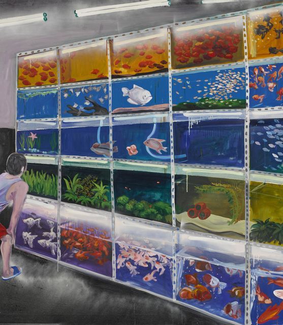 藝術家黃海欣的創作刻劃出一種當代日常生活中的怪誕狀態,在她創造的圖像背後,隱藏著社會中各種偏離、刻板的怪異價值。作品〈水族館〉,描繪著一個有著人造水族館的室內場景,水族館壯觀地擺放著一格一格的魚缸,魚缸內養殖著各式鮮豔美麗的水底生物。這些水底生物是人類可以擁有的商品,只要喜歡,任何人都可以將牠們購買回去。在這個看似尋常普通的場景內,卻潛藏著人類行徑的荒謬,以及人們心裡的寂寞與不安。黃海欣的繪畫創作,以不同視角詮釋當代人內在與心理意識的狀態,看似荒誕卻又非常真實。